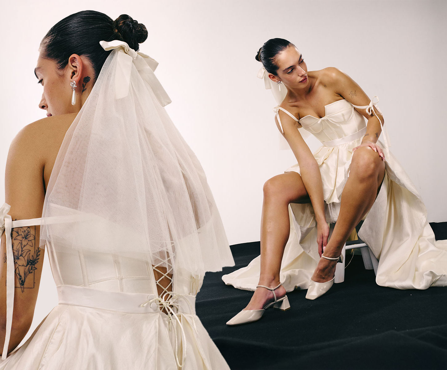 The Colette features a meticulously crafted corset with a delicate bow and silk taffeta cap sleeves, offering an elegant, structured look. The skirt, made from luxurious silk taffeta, is shorter in the front and extends gracefully at the back, creating a dramatic, luminous silhouette. The combination of corset and skirt delivers a sophisticated, feminine presence.